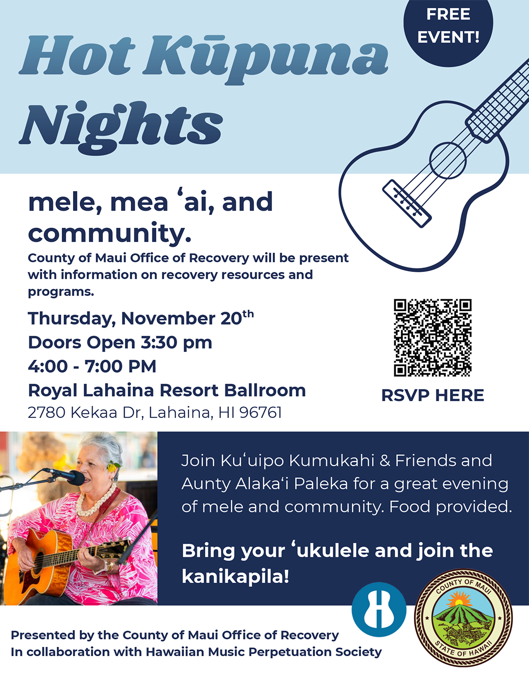 County of Maui Office of Recovery, in collaboration with Hawaiian Music Perpetuation Society (HMPS), is hosting Hot Kūpuna Nights on Thursday, Nov. 20, from 4 to 7 p.m. at the Royal Lahaina Resort Ballroom.